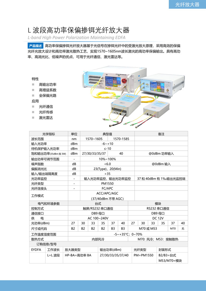 高功率保偏掺铒光纤放大器基于光信号在掺铒光纤中的受激光放大原理,采用高效的保偏光纤光放大设计和高功率激光散热工艺,实现1570~1605nm波长激光的高功率保偏输出。具有高功率、高消光比、低噪声的优点,可用于光纤通信、激光雷达等。