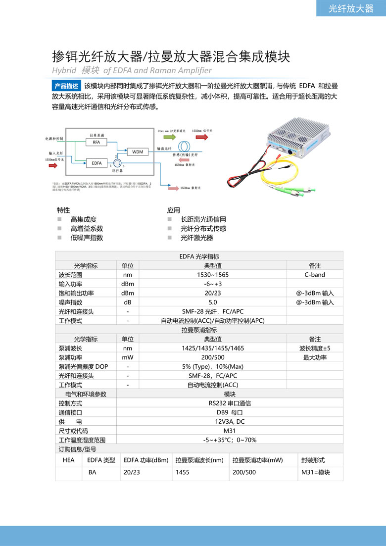 该模块内部同时集成了掺铒光纤放大器和一阶拉曼光纤放大器泵浦,与传统 EDFA 和拉曼放大系统相比,采用该模块可显著降低系统复杂性,减小体积,提高可靠性。适合用于超长距离的大容量高速光纤通信和光纤分布式传感。