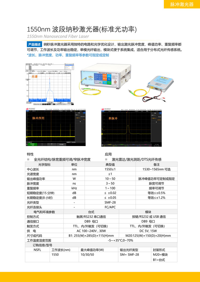 纳秒脉冲激光器采用独特的电路和光学优化设计,输出激光脉冲宽度、峰值功率、重复频率都可调节,工作波长及功率输出稳定,单模光纤输出,模块式便于系统集成,适合用于分布式光纤传感系统。*波长、脉冲宽度、功率、重复频率等参数可指定或定制