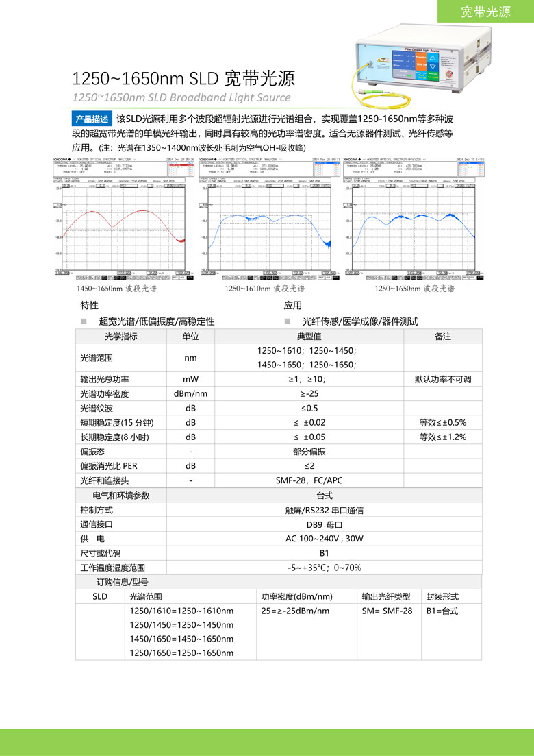 该SLD光源利用多个波段超辐射光源进行光谱组合,实现覆盖1250-1650nm等多种波段的超宽带光谱的单模光纤输出,同时具有较高的光功率谱密度。适合无源器件测试、光纤传感等应用。(注:光谱在1350~1400nm波长处毛刺为空气OH-吸收峰)