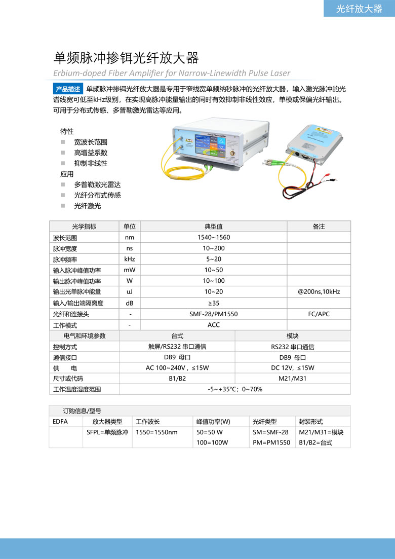 单频脉冲掺铒光纤放大器是专用于窄线宽单频纳秒脉冲的光纤放大器,输入激光脉冲的光谱线宽可低至kHz级别,在实现高脉冲能量输出的同时有效抑制非线性效应,单模或保偏光纤输出。可用于分布式传感、多普勒激光雷达等应用。